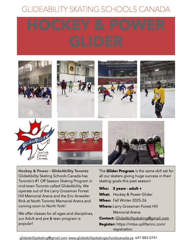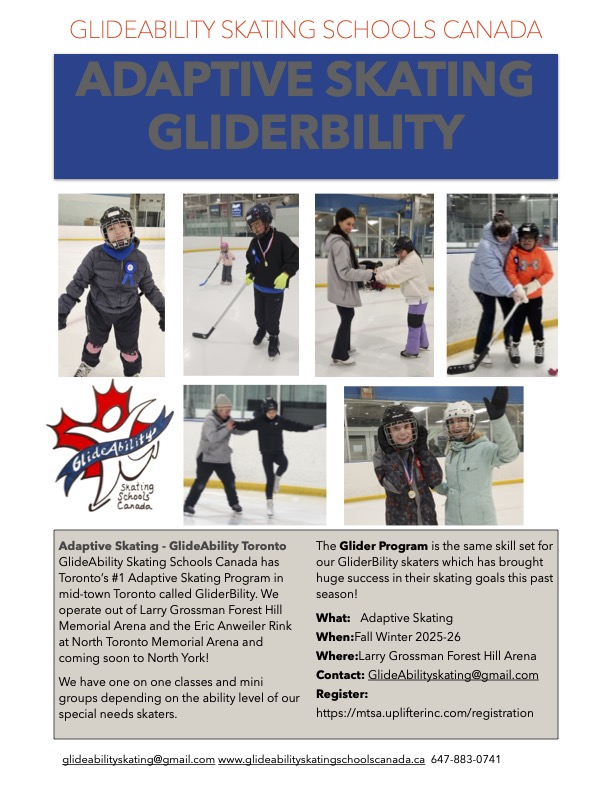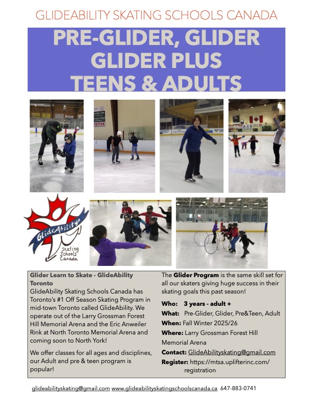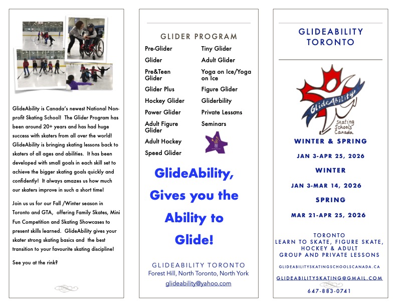 GlideAbility Skating Schools Canada is a non-profit, national, Canadian developed skating school for skaters of all ages, levels, disciplines. The Glider Program suits all needs from hockey, figure skating, learn to skate, special needs and adult skating. The Glider Program has been a huge success for skaters from all over the world, first as Metro Toronto Skating Academy and then GlideAbility for the past 19 years!